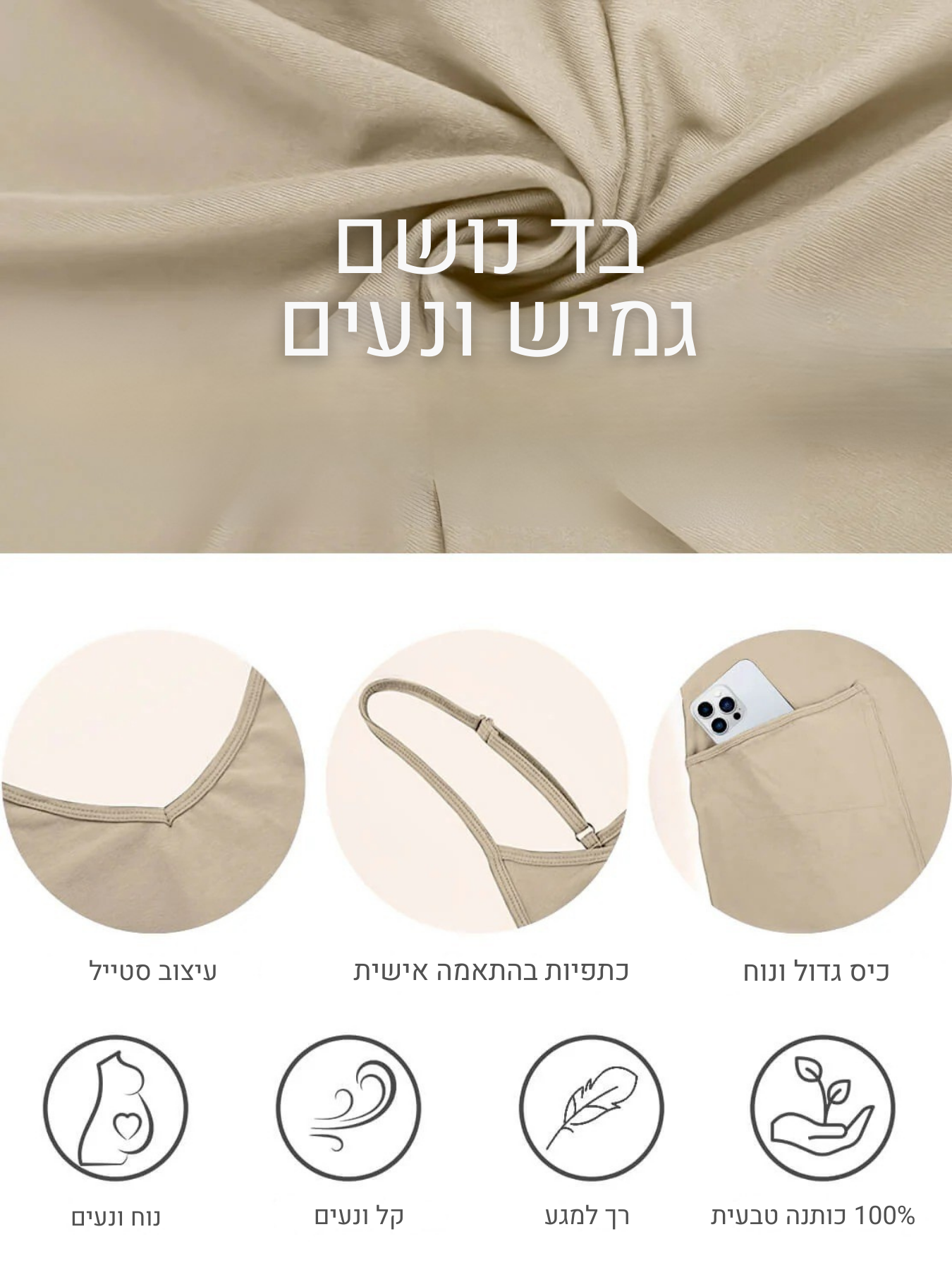 We recommend sizing up for maximum comfort and a relaxed fit, especially if you’re in the later stages of pregnancy or between sizes. The stretchy fabric and adjustable straps provide plenty of flexibility for sizing.
